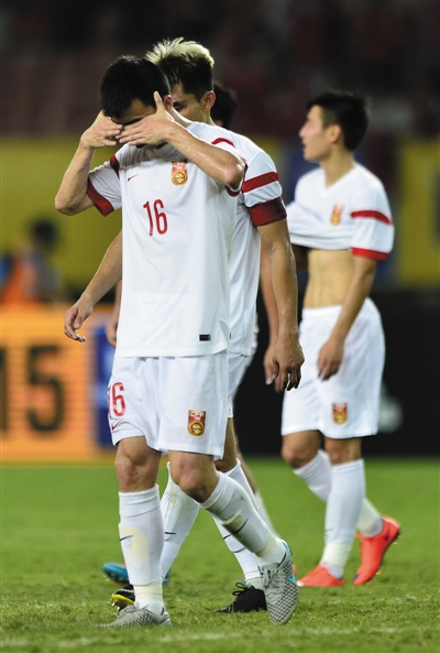 孙可双手掩面,他在终场前的一次突破是国足为数不多的亮点。