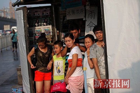 北京下起太阳雨 路人报摊亭躲雨