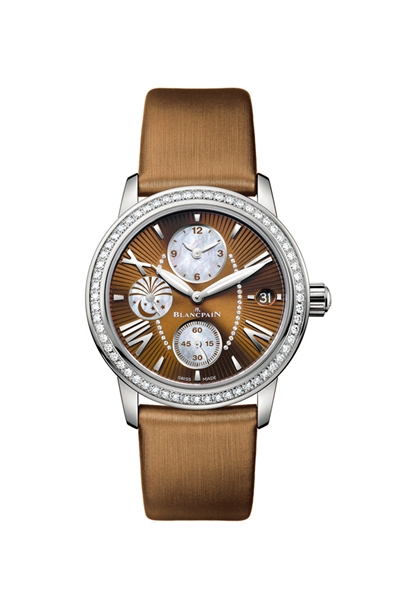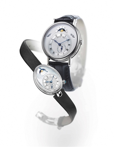 偏心刻度圈以及偏心小秒针盘、蓝钢宝玑针与巴黎钉纹,种种细节将这两只表紧密联系在一起,当然12点位置的月相盘更是有道不尽的缱绻之意。
