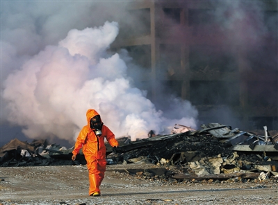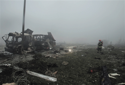 昨日,爆炸现场西部区域一个着火点附近,消防员正在勘测。 新华社发