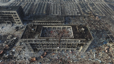 昨日7时,新京报记者操控无人机俯瞰爆炸点附近,天津港公安局跃进路派出所和天津港公安局交通警察支队只剩残骸。 新京报首席记者 陈杰 摄