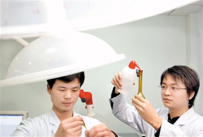 2007年1月,乌鲁木齐市疾病预防控制中心断隔流动分析室,工作人员在进行水中氰化物检测。