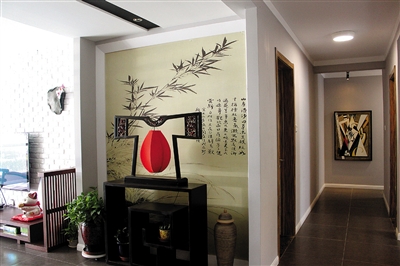 整个空间没有特定的风格,简约现代以及中式元素,在每个空间都完美结合起来。进门位置的左手边和右手边是简约的收纳柜,正对门口的玄观设计给人眼前一亮。玄关背景墙是一幅竹影图,在暗黄灯源下,流露出竹影婆娑的效果;玄关柜呈“回”字形,与中式造型的装饰灯相映成趣,绿色植物点缀其中,给人视觉上的享受。