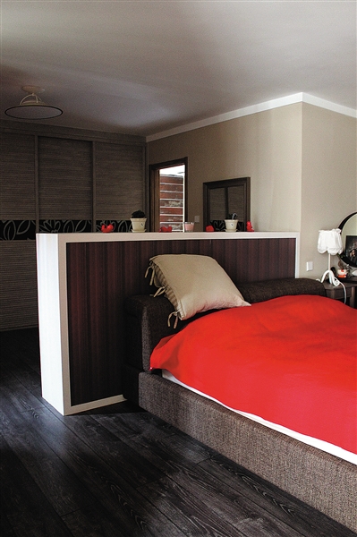 在小两口的主人房中,简约现代风格成为主色调,地板采用了黑色调,透露出冷静稳重的气息,吧台、软床采用了相近色色调,大红色的床品点亮了空间,也流露出主人的新婚喜悦。进门处的书架和单椅给了主人休闲空间,更显舒适自在。