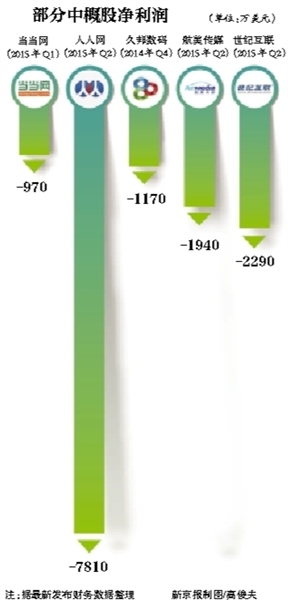 人人网在2015年第二季度的净亏损为7810万美元,第一季度净亏损2760万美元,上半年共亏了1亿美元;久邦数码由去年第四季度开始同比转亏,亏损1170万美元;学大教育2014年第四季度净亏1670万美元,在今年第一季度仅获得区区90万美元的净利润。