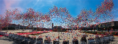最终,腾飞的气球形成了一条曲线,“你看,这好像一条龙啊”,在观众们对形状的不同想象中,阅兵纪念仪式正式结束。