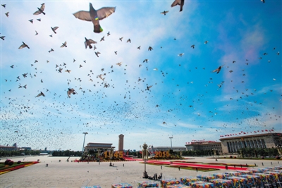场景:昨日,中国人民抗日战争暨世界反法西斯战争胜利70周年阅兵活动举行。最后一个空中梯队飞过天安门广场后,7万只白鸽放飞蓝天。新华社发