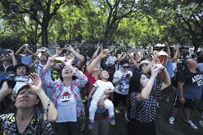 场景:空中梯队经过时,市民纷纷拿出相机手机拍摄。新京报记者 浦峰 摄