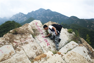 8月31日,昌平南口村,1937年南口战役打响的地方,杨国庆在峰顶石头处刻下了当年战役的简介。摄影/新京报记者 浦峰