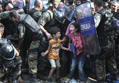 8月21日,难民从希腊边境试图进入马其顿境内时与警方发生激烈冲突,儿童受到惊吓大哭。