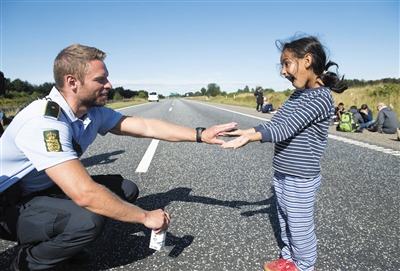 丹麦警察在封闭的高速路上和前往瑞典途中的小难民玩耍。
