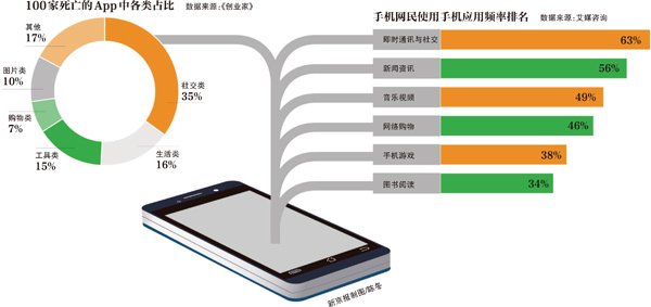 移动社交领域的创业机会向不同背景、不同身份的创业者一视同仁地敞开了大门,但低门槛也抬高了死亡率。所以从死亡率上讲,社交类的App没有这么幸运,艾媒咨询报告显示,在100家死亡的App里,社交类占了35%,是死亡率最高的类别。