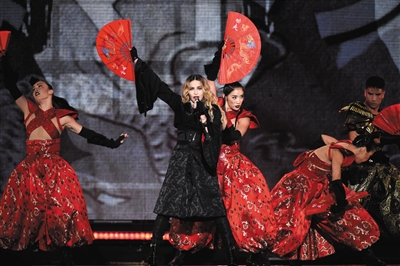 9月16日,纽约,麦当娜的“Rebel Heart”全球巡演走中国风,黑裙被称神似聂隐娘,扇子写有“功夫”二字。
