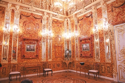 “琥珀宫”以琥珀和金箔建成,二战时被德军拆装运走,至今下落不明。图为俄罗斯复刻还原的“琥珀宫”。图/CFP