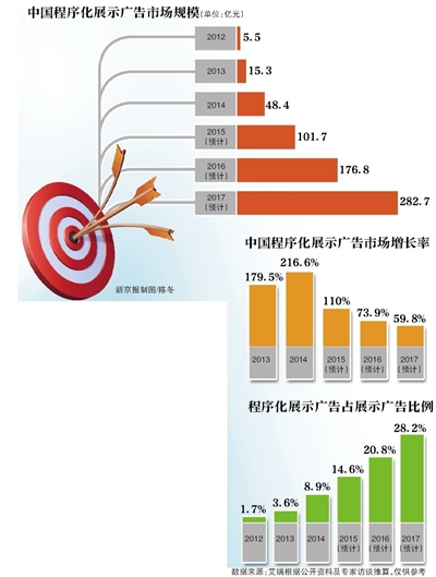 《2014年中国DSP发展情况》预计,2017年中国程序化购买市场整体规模将达到282.7亿元,占中国展示广告市场的比例将达到28.2%。