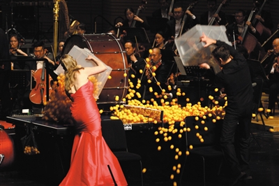 新京报讯 (记者陈然)一张球桌被搬上舞台,两位穿着晚礼服的球手在管弦乐团和指挥家前打起了乒乓,而球撞击球拍、桌地面、鼓皮、高脚杯的声音和节奏也被融入了音乐。这是本周四晚在北京国际音乐节上出现的一幕。美国新生代作曲家安迪·秋保应北京国际音乐节和上海夏季音乐节之邀,特意创作该曲目。作品依照“独奏乐器与管弦乐团协奏”的形式,一位小提琴家、一位打击乐家和两名乒乓球手充当了“独奏者”。秋保为乒乓球手也写下了“谱子”,注明在哪些段落球手该以何种速度和方式击球。