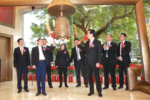11时50分,恒大集团董事局主席许家印与阿里巴巴集团董事局主席马云一起敲响开市钟声。
