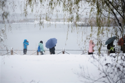 11月6日,延庆,人们在雪中的野鸭湖湿地公园游玩。新京报记者 周岗峰 摄