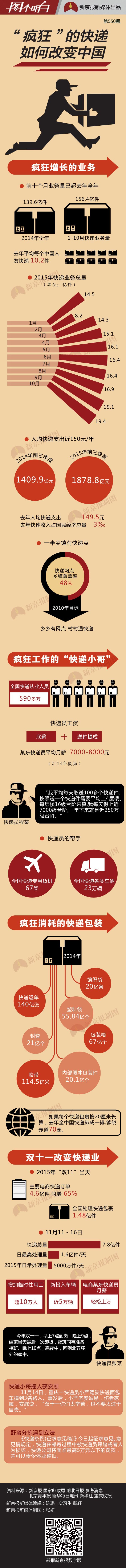 2014年,中国快递业务量达到139.6亿件,相当于每个中国人寄出10.2件。如果每个快递包裹按长20厘米算,去年全中国快递排成一排,能绕赤道70圈。今年还没过完,前十个月的快递业务量已经超过去年全年,达到156.4亿件。平均每天处理的包裹超过5000万件,而这个数字在今年“双十一”期间,达到1.6亿件。双“十一”改变了中国快递业,疯“长”的快递改变着中国。