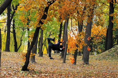 场景:红叶树下,一位晨练的市民。