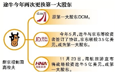 新京报讯 (记者赵嘉妮)11月23日,途牛旅游网与海航集团旗下航空旅游业态核心企业海航旅游集团共同宣布战略结盟。海航旅游将战略投资途牛5亿美元,成第一大股东。这是途牛今年第二次更换第一大股东。