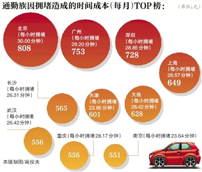 报告还显示,经济越发达、基本工资越高的城市,因拥堵造成的损失越大。每个月因拥堵造成时间成本超过600元、排在北京之后的依次是广州(753元)、深圳(728元)、上海(649元)、大连(628元)、天津(601元)。