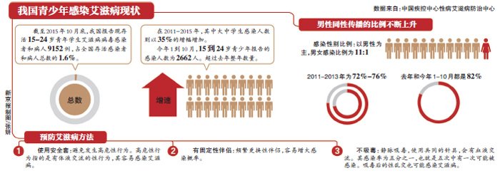 12月1日是世界艾滋病日,近日中国疾控中心性病艾滋病防治中心主任吴尊友透露,近5年我国大中学生艾滋病病毒感染者年增35%。青年学生艾滋病疫情主要以性传播为主,主要是男性同性性转播。截至今年10月底,我国报告现存活15-24岁的青年学生艾滋病病毒感染者和病人9152例。