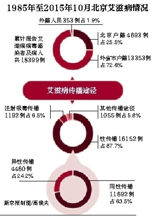据了解,1985年北京市发现全国首例艾滋病病例。30年后,截至2015年10月末,北京市累计报告的艾滋病病毒感染者及病人共18399例,其中,16152例艾滋病病毒感染者和病人通过性传播,占比达87.7%(同性传播11692例,占63.5%;异性传播4460例,占24.2%),现存活感染者及病人共13106人。