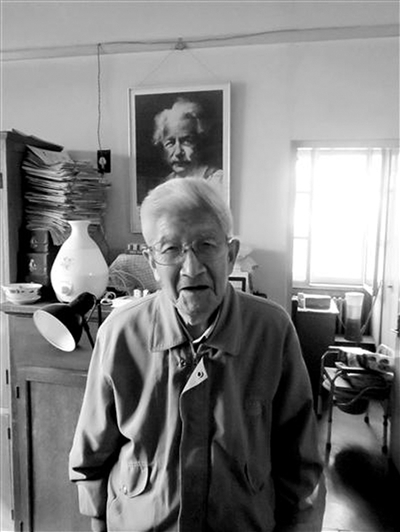 许良英先生,背后是爱因斯坦画像。许先生译介了大量爱因斯坦作品。