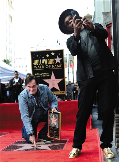 12月21日,塞缪尔·杰克逊用手机拍摄美国导演昆汀·塔伦蒂诺留名好莱坞星光大道。