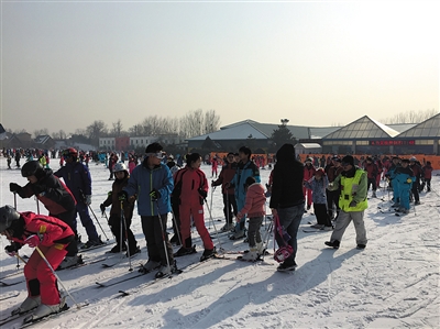 市内除了冰场,冰雪嘉年华也成为亲子游的热门选择。昨日,在龙潭公园冰雪嘉年华内,不少家长带着孩子在游玩。新京报记者体验发现,在冰雪嘉年华内,存在人流过于密集、疏导工作人员不够等安全隐患。