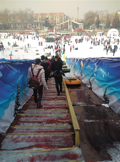 昨日,龙潭公园冰雪嘉年华内,楼梯上上下客流混行,极易摔倒。