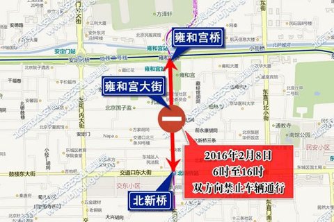 新京报快讯(记者郭超)2月4日,记者从交管部门了解到,为保证雍和宫礼佛敬香秩序,2月8日(正月初一)雍和宫大街将实行交通管制,当天6时至16时,雍和宫大街由雍和宫桥下路口(不含)至北新桥路口(不含)双方向车辆禁行。