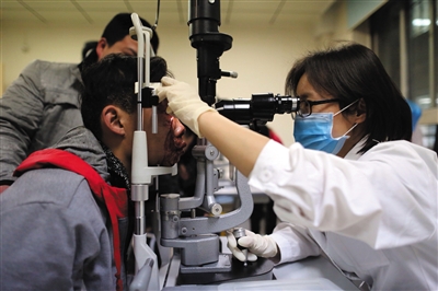 每年春节,烟花爆竹伤就会增多。医生正在为患者检查被爆竹炸伤的双眼。新京报记者 王叔坤 摄