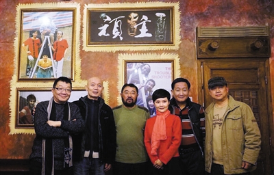 演员李耕、葛优、导演米家山和马晓晴、梁天以及当年的制片主任周军在特意布置了海报和幕后照片的《顽主》厅合影留念。