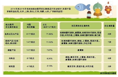 新京报记者又进一步对2014年以来国家及地方食药监部门的食品抽检信息进行梳理。经不完全统计,检出抗生素超标或使用违禁抗生素的食品达127批次,数量从大到小依次涉及鱼类及水产品、禽类、蜂蜜、肉制品、鲜鸡蛋。鱼类及水产品最多,高达91批次,问题集中在呋喃唑酮代谢物、氯霉素、呋喃西林代谢物、恩诺沙星、环丙沙星、土霉素、呋喃它酮代谢物、喹乙醇等抗生素,多达8种。检出兽用抗生素的不乏一些知名企业,号称“养猪第一股”的雏鹰农牧就曾在2015年有1批次产品含违禁兽药氯霉素。
