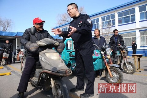 2016年3月8日,顺义公安分局杨镇派出所,老先生骑上自己刚刚认领的被盗电动车,民警再三叮嘱注意防盗和安全驾驶。 新京报记者 尹亚飞 摄