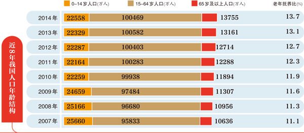 官方披露的数据显示,近年中国的老年人口比例不断上升,从2010年13.3%提高到2014年的15.5%。目前,中国已成为人口老龄化发展速度最快的国家之一。