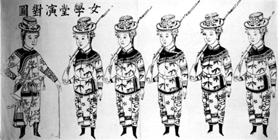 左图:女学堂演对图。女学员头戴礼帽,肩上扛枪;所有女性都是经过民装改造的小脚。这些画作对近代女性的觉醒起着一定的推动作用。右图:晚清民国的女学堂。