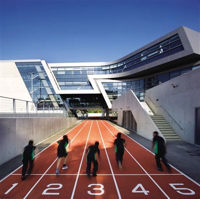 位于南伦敦布里克斯顿的伊夫林·格雷斯学院,有四个分散的学校,哈迪德设计成了一个Z字形的校区,一条200米的跑道从建筑下面穿过。这是哈迪德1980年在伦敦从业以来,为这个城市所做的第一个大型项目。