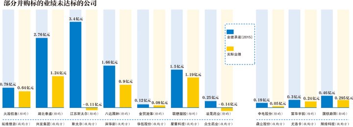 据证券时报不完全统计,截至2016年3月30日,共有124家公司披露了并购资产2015年业绩承诺实现情况,其中有27项承诺未达标。而在2014年的310项业绩承诺中,有42项未完成。由于2015年报披露尚未过半,从上述业绩承诺的未达标比例来看,2015年业绩承诺“落空”的数量超过2014年已是大概率事件。