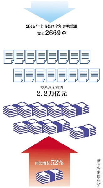 据新华社援引证监会数据显示,2015年上市公司全年并购重组交易2669单;交易总金额约2.2万亿元,同比增长52%,并首次超过2万亿元,创出了A股市场的又一个高峰。
