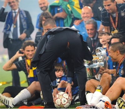 2010年欧冠决赛,时任国际米兰主教练的穆里尼奥弯腰捡球,结果裤子撕裂。