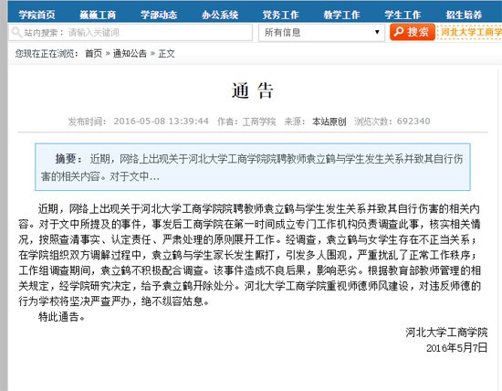 5月8日,河北大学工商学院官网发布通报称,经调查,袁立鹤与女学生存在不正当关系;在学院组织双方调解过程中,袁立鹤与学生家长发生厮打,引发多人围观,严重扰乱了正常工作秩序;工作组调查期间,袁立鹤不积极配合调查。该事件造成不良后果,影响恶劣。根据教育部教师管理的相关规定,经学院研究决定,给予袁立鹤开除处分。