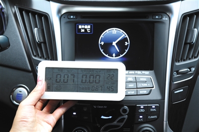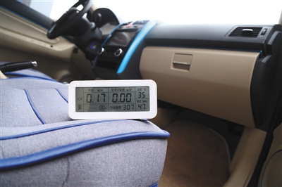 实验过程:实验之前,先检测车厢内温度。随后,把4个车门及车窗全部打开,让车内外空气流通,等待3分钟热气排出后再坐进去发动汽车,打开空调外循环。约3分钟后,车厢内外温度相近时,再关闭车窗,检测车内温度。最后,启动空调内循环,将温度调到最低档位,再次检测车内温度。