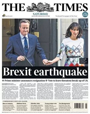 同为留欧派的《泰晤士报》则将英国脱欧称为一场“地震”,将带来英国的分裂。