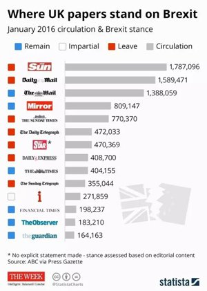 一方面,脱欧派报纸多是小报,传统上就以具有煽动性、倾向性著称,在英国很有市场。如《太阳报》和《每日邮报》的发行量在英国稳居前二。而支持留欧的则多是传统精英大报,如《卫报》、《金融时报》等。