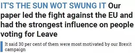 《太阳报》今天就毫不含糊地“自我表扬”了一番,声称该报“领导”了这场针对欧盟的战争,在民众投脱欧票的过程中起了重要作用。该报还引用一家调查机构的数据称,投脱欧票的人中,有30%的人受到《太阳报》脱欧运动的影响。
