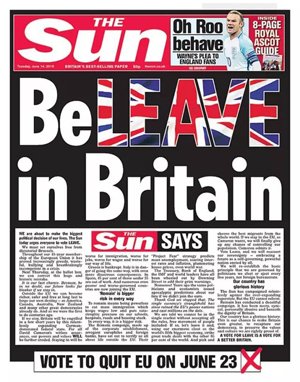 本月14日,《太阳报》在头版用醒目的大标呼吁,“投票脱欧吧!”标题下的社论也鼓励英国人在公投当天投票脱欧,将英国从“独裁的布鲁塞尔”中解脱出来。