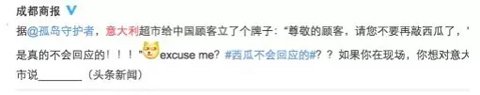 虽然超市的牌子是用意大利语写的,而且也木有注明是针对中国人,但由于“买西瓜前先敲一敲”这一标准动作早已深入中华儿女的血液里,且是祖祖辈辈地流传了下来。外事儿(微信ID:xjb-waishier)发现,这条微博迅速发酵,引发国内网友热议。